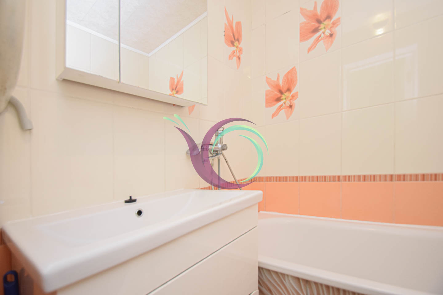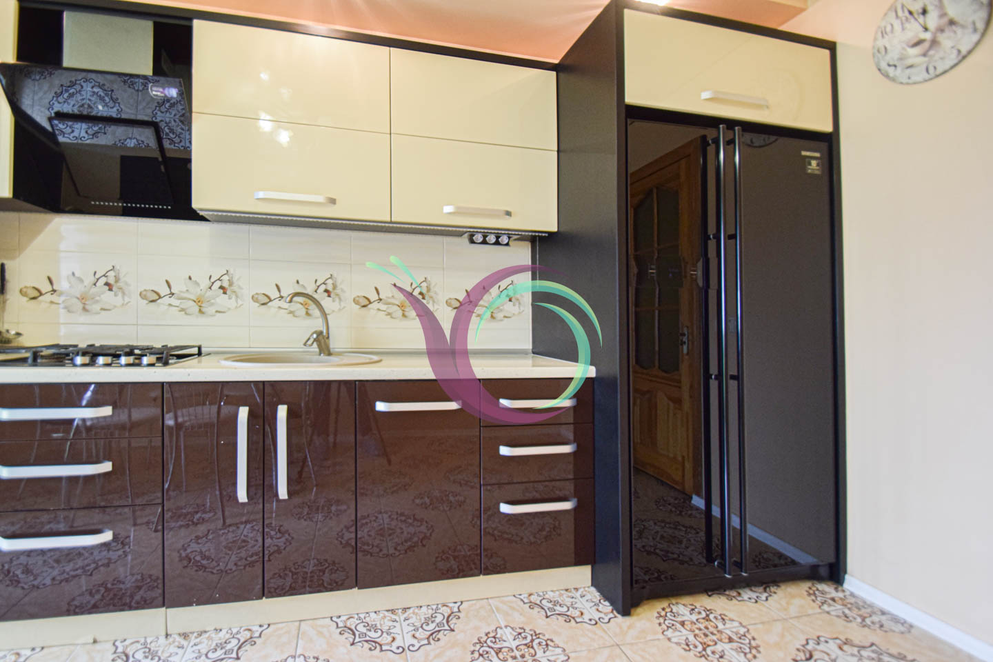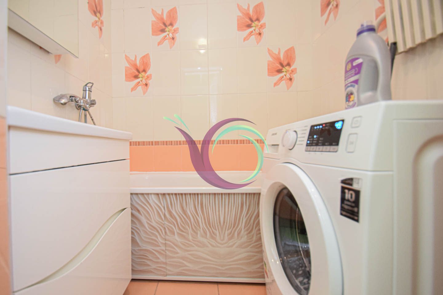 Затишна квартира має роздільне планування: окремі вітальня та спальна кімната з міжкімнатними дверима. Кухня площею 15 м2 з виходом на лоджію має шафами для посуду варильну поверхню (газова), витяжку, електричну духову шафу, мікрохвильову піч, холодильник, посудомийну машину. Санвузол роздільний. У ванній кімнаті наявні ванна, рукомийник з тумбою і пральна машина.