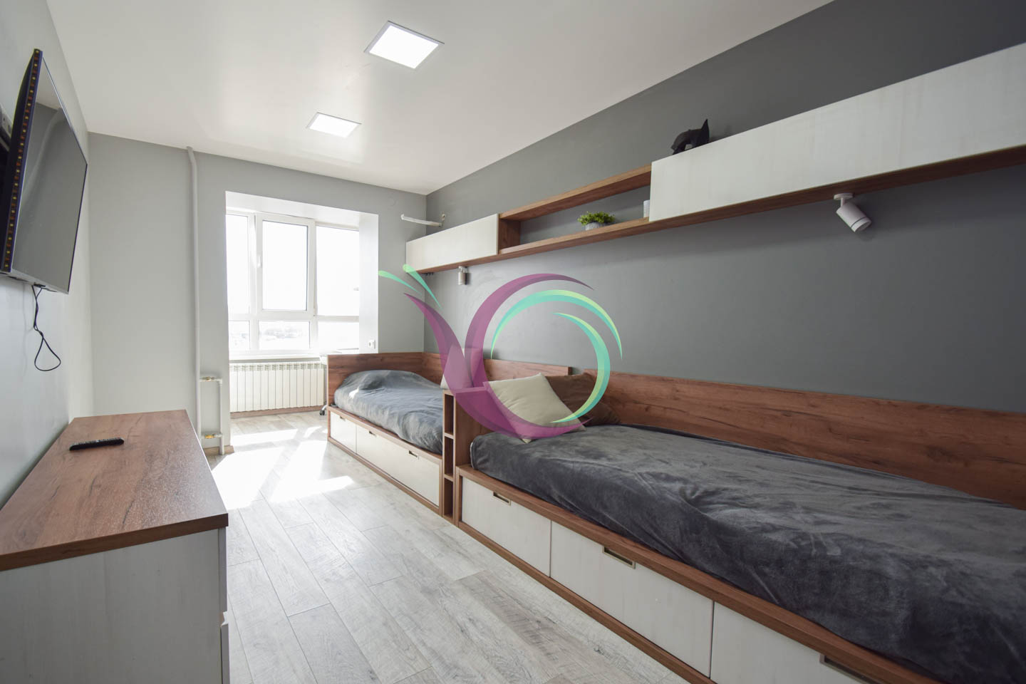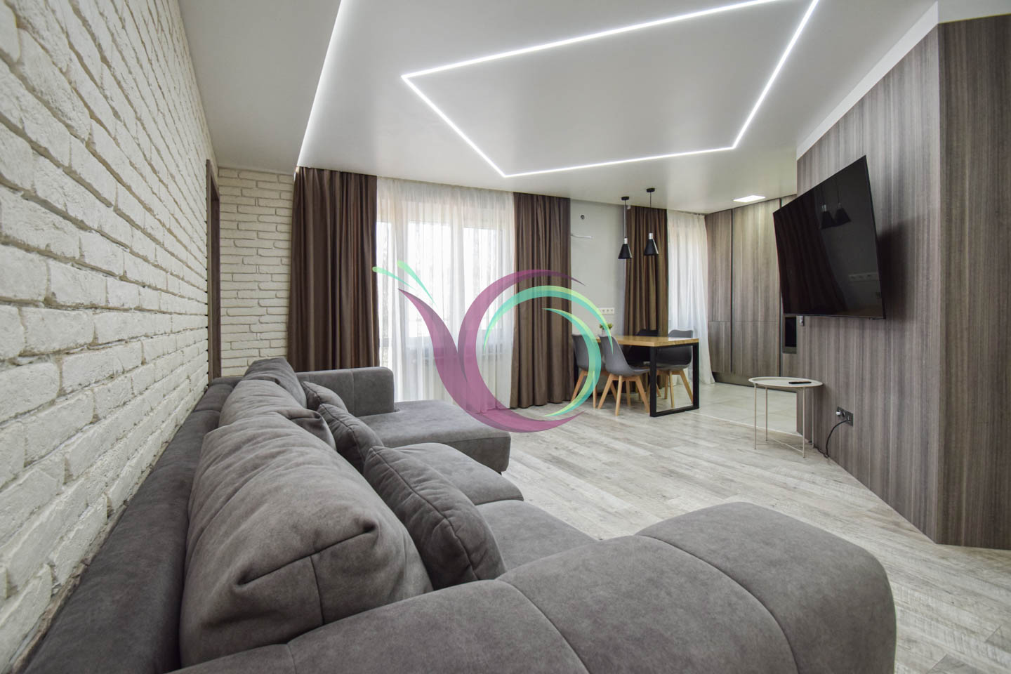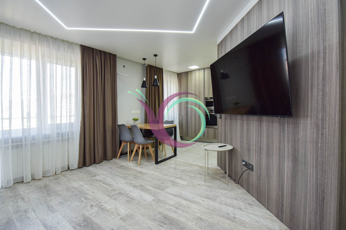 Світла квартира має 3 окремі мебльовані кімнати зі зручними ліжками та відокремленими комп’ютерними столами для дистанційного навчання. Кухня-вітальня умовно розділена на зону готування їжі площею 11 м2 обладнану шафами для посуду та всією необхідною побутовою технікою (мікрохвильова, духовка,