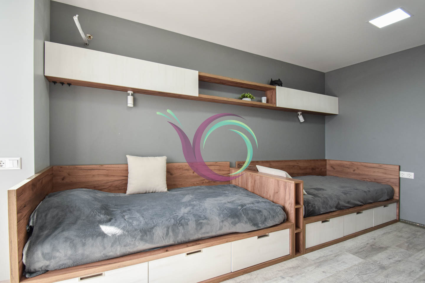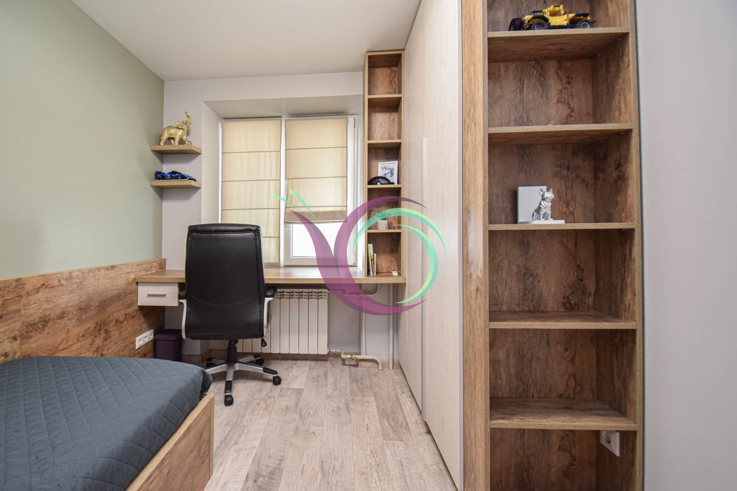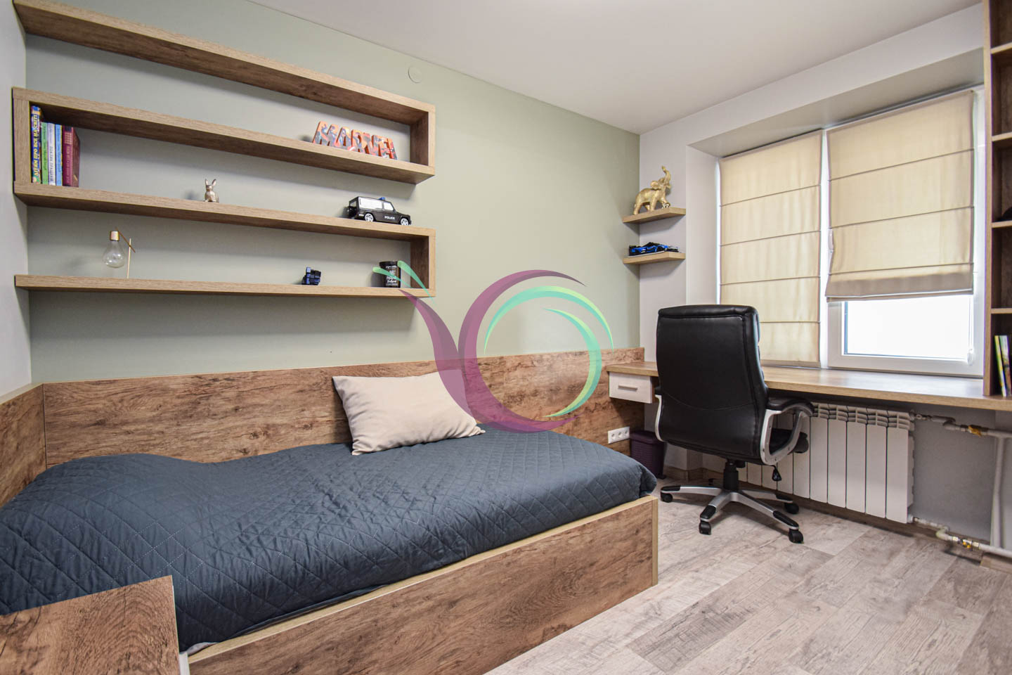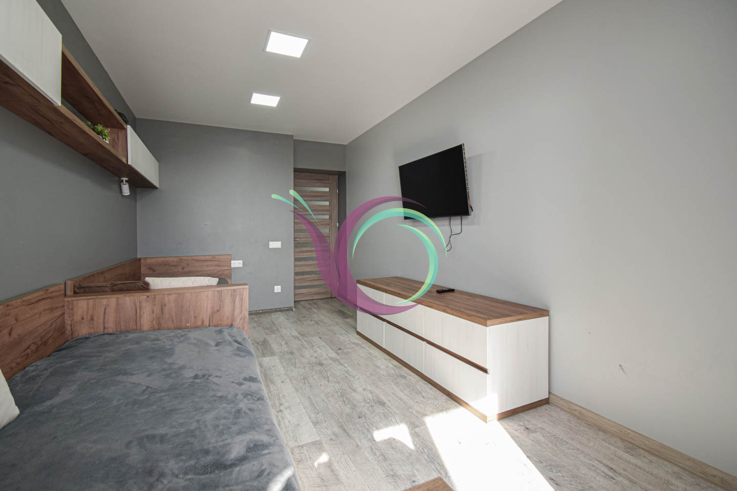 Світла квартира має 3 окремі мебльовані кімнати зі зручними ліжками та відокремленими комп’ютерними столами для дистанційного навчання. Кухня-вітальня умовно розділена на зону готування їжі площею 11 м2 обладнану шафами для посуду та всією необхідною побутовою технікою (мікрохвильова, духовка,