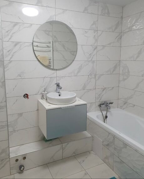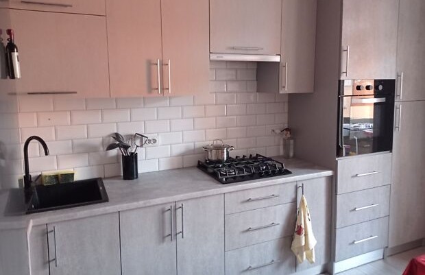 Світла затишна квартира з ремонтом має роздільне планування. Кухня площею 12 м2 має шафи для посуду, холодильник, плиту, духовку, витяжну вентиляцію, зручну робочу зону. Вітальня вдало розділена на зони – для відпочинку та для зустрічей з гістьми. У компактній ванній кімнаті є пральна машина та душова кабіна.