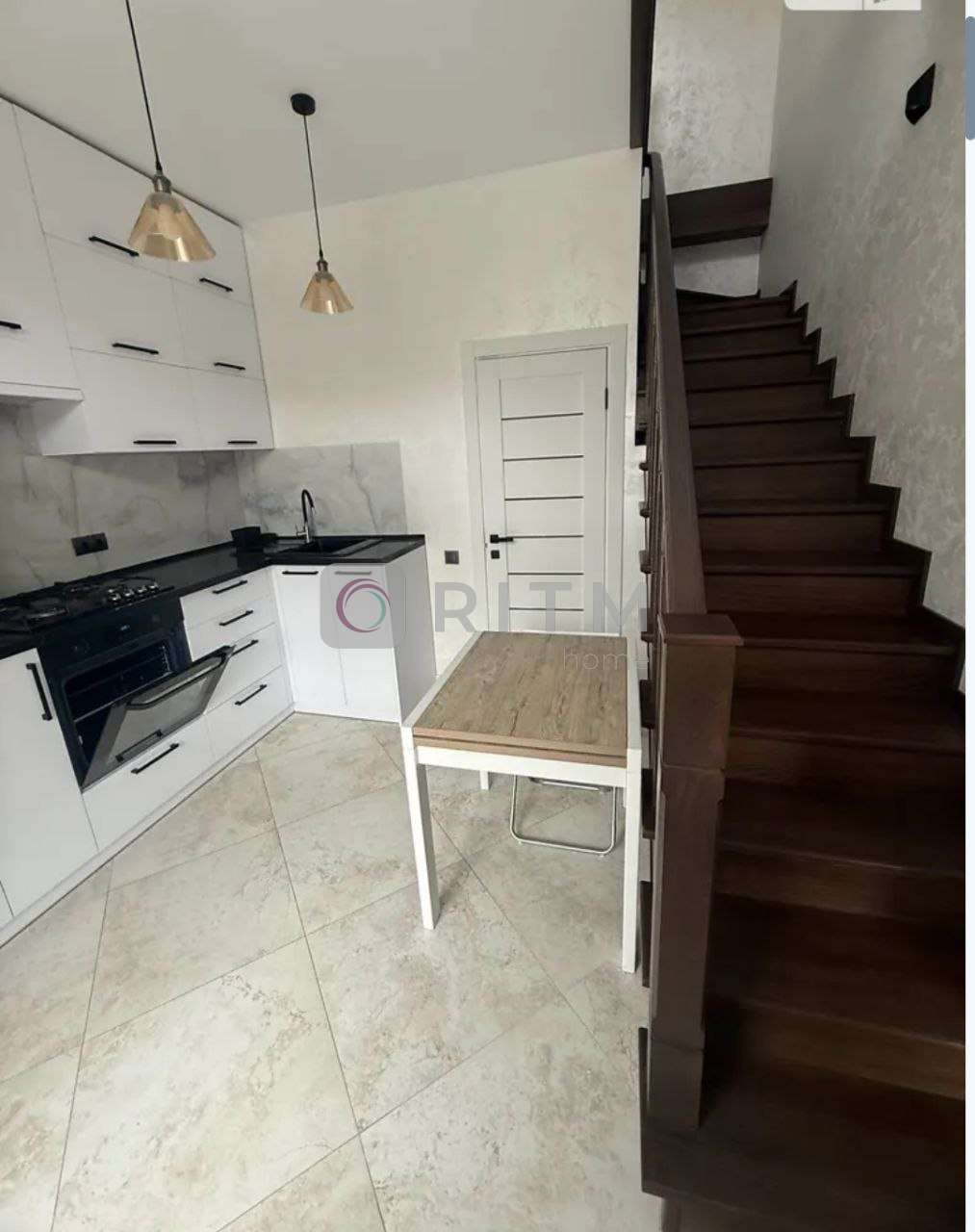 Квартира має зручне планування на двох рівнях, що створює відчуття приватного будинку. На першому рівні — простора кухня та вітальня для відпочинку і зустрічей з друзями, на другому — затишна спальня зона. Великі вікна наповнюють помешкання природним світлом, що додає тепла та комфорту.