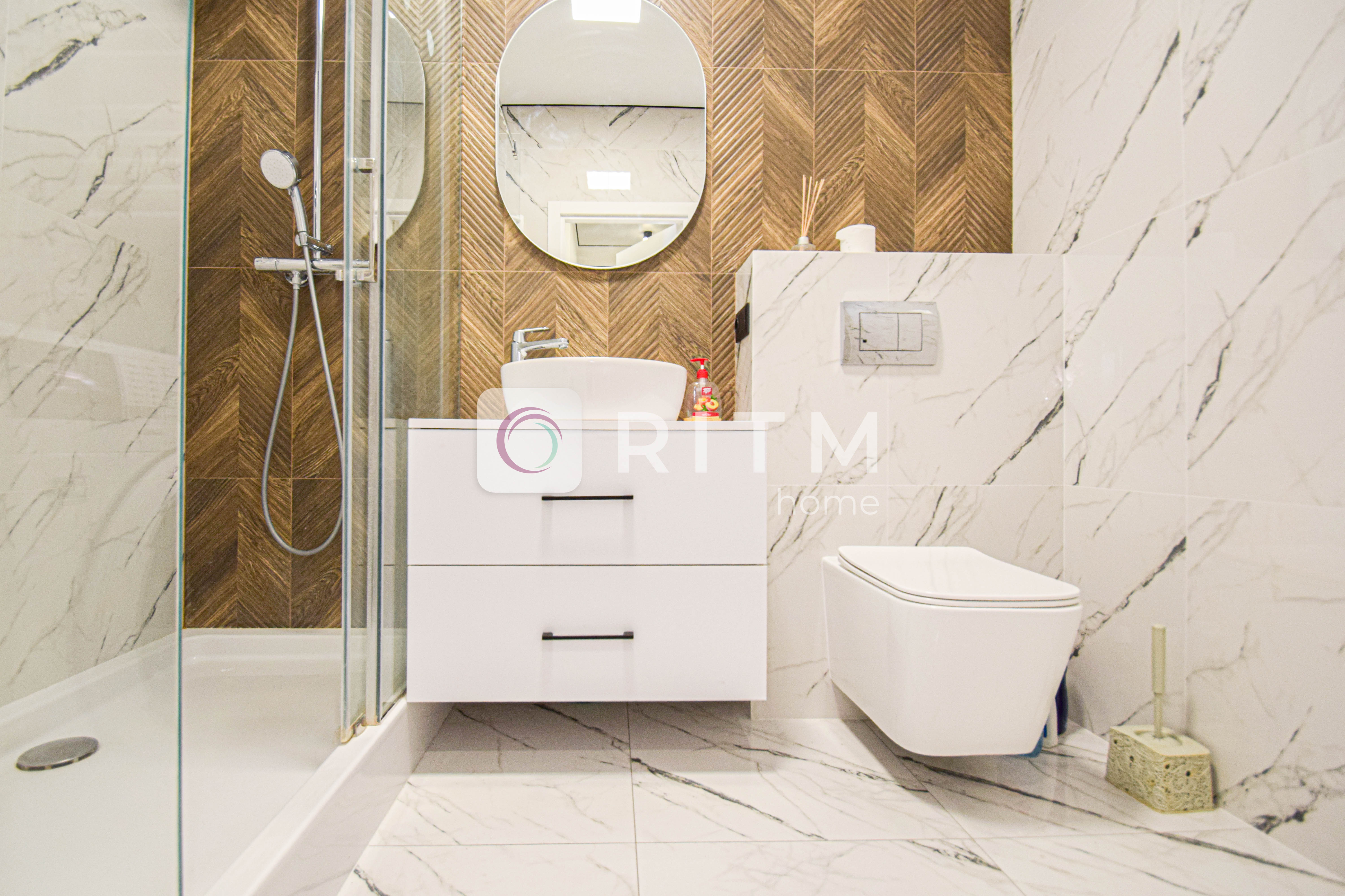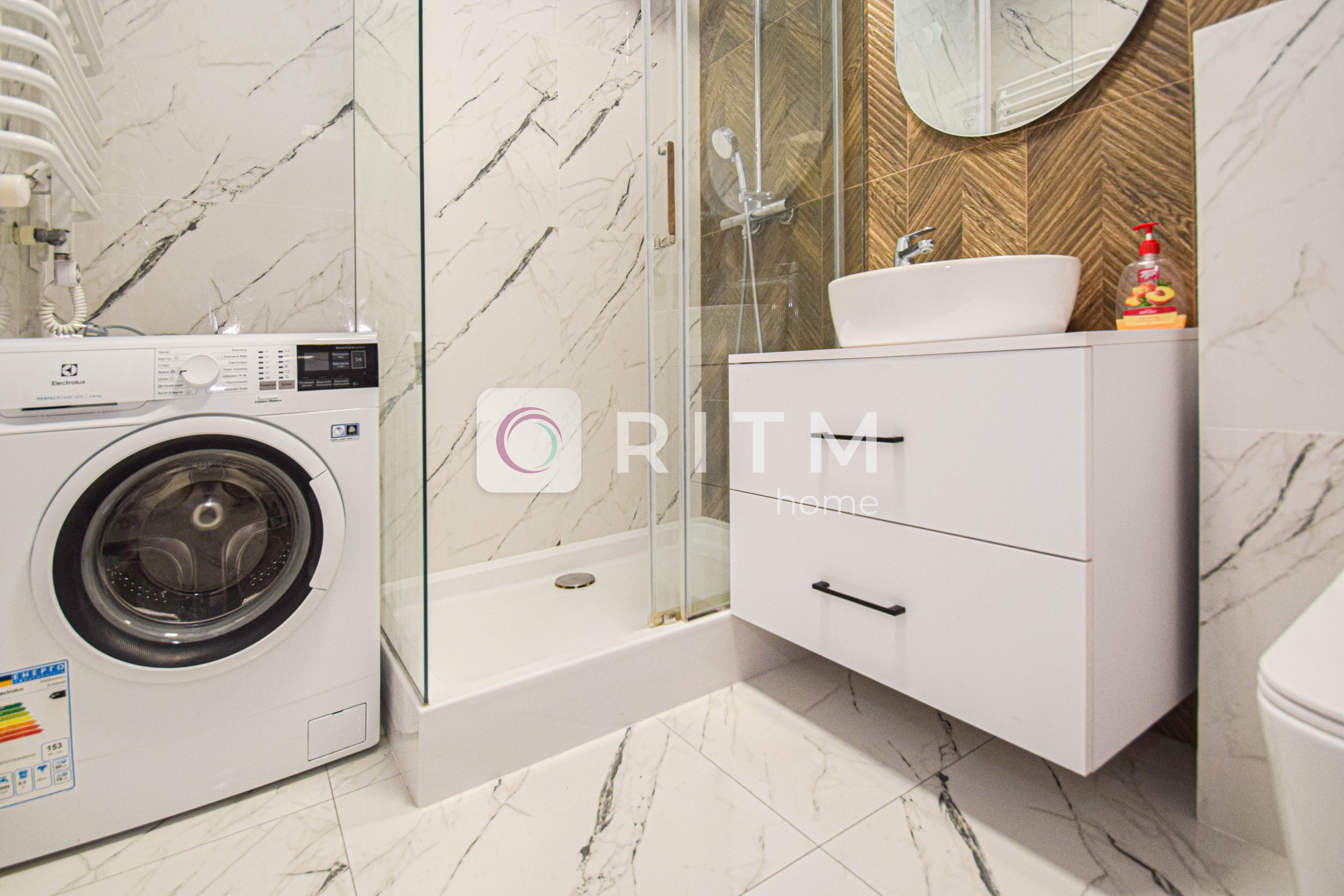 Кухня обладнана необхідною технікою. У компактній ванній кімнаті є пральна машина та душова кабіна.