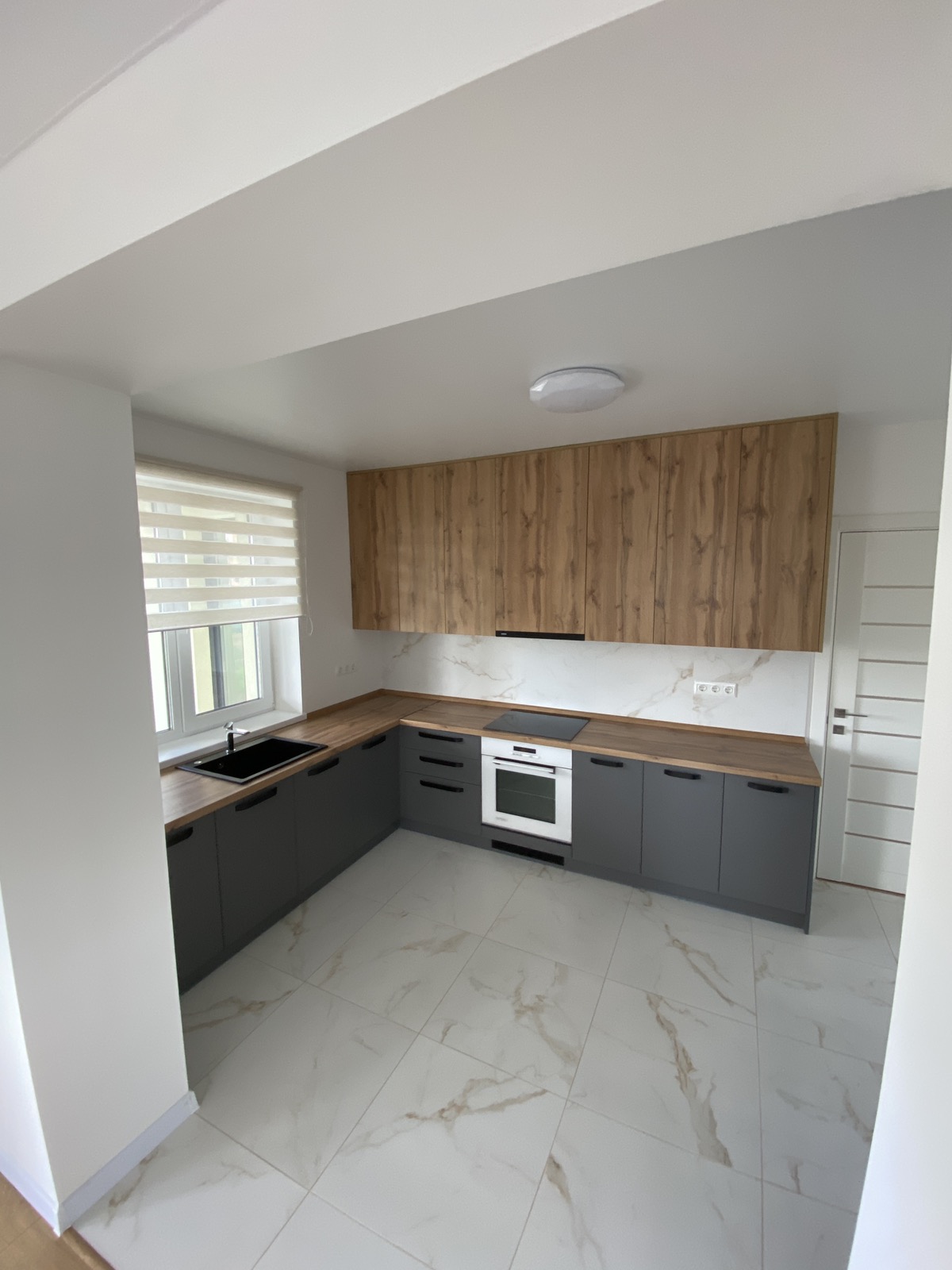 Кухня обладнана шафами для посуду та необхідною побутовою технікою – холодильник, плита, духова шафа, мікрохвильова піч, електрочайник, витяжна вентиляція тощо. А також має зручну обідню зону.